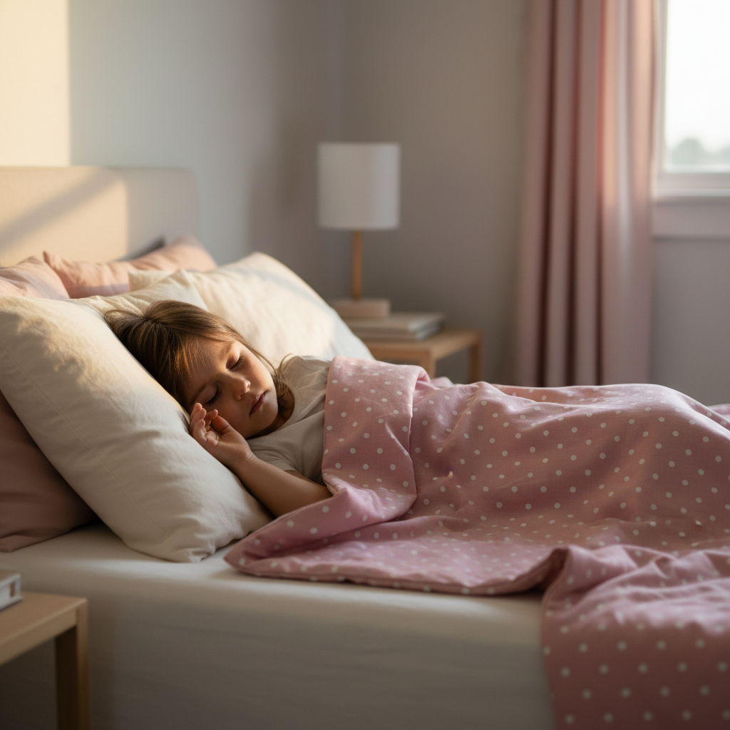 Set uključuje dječju tešku dekicu i prozračnu navlaku od eko pamuka, stvarajući umirujuće okruženje za san i dnevni odmor te prostor u kojem se mala tijela mogu usporiti, regulirati i utonuti u dublji, mirniji san.
